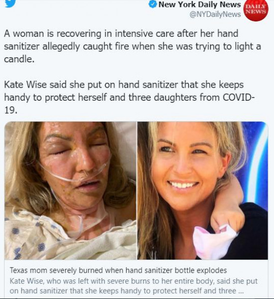 وحذر الخبراء من أن معقمات الأيدي، التي يحتوي الكثير منها على الكحول، ويمكن أن تكون قابلة للاشتعال، وعادة ما تحتوي الزجاجات على تحذير يقول بإبقاء المنتج بعيدا عن اللهب أو النار.