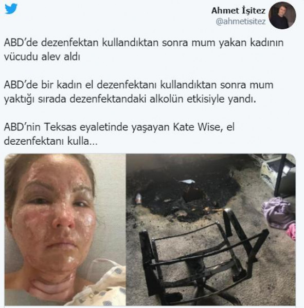 وتحذر كيت الآن الآخرين من مخاطر استخدام معقم اليدين، الذي يحتوي على الكحول، عندما يكون قريبا جدا من اللهب المكشوف.وقالت الأم لشبكة KHOU-TV التلفزيونية المحلية: "يمكن لشيء صغير مثل إضاءة شمعة أن يكون سببا في اندلاع حريق".
