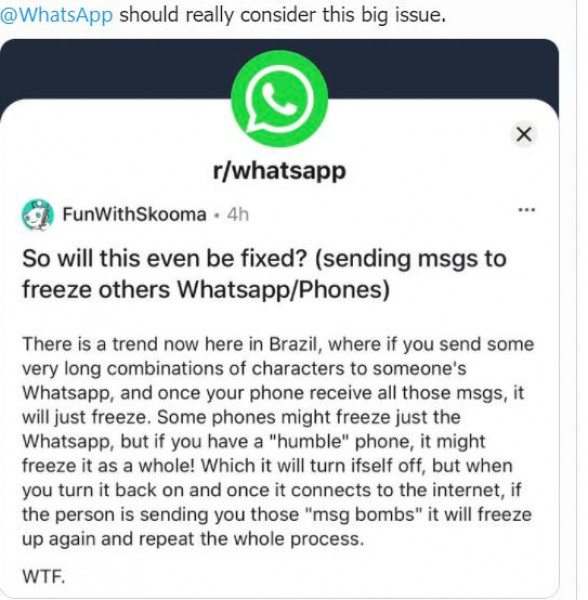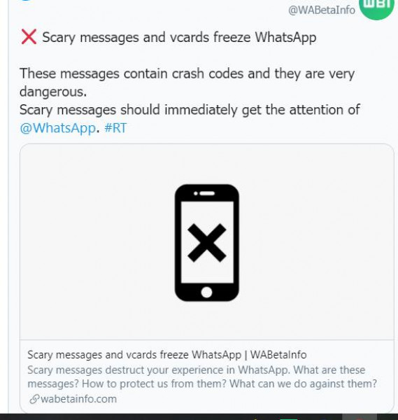 قد يفسر الرسالة بطريقة خاطئة، وأحيانا يتعذر على "واتساب" أيضا عرض الرسالة تماما، لأن هيكلها غريب جدا: يؤدي الجمع بين هذه الأحرف إلى خلق حالة يتعذر فيها على التطبيق معالجة الرسالة، ما يؤدي إلى حدوث عطل لانهائي. والتعطل اللانهائي يعني أنه عند فتح "واتساب" يتعرض لخلل. إذا حاولت فتح التطبيق مرة أخرى، فسيظل يتعطل".
