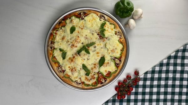 9- أخرجي الصينية من الفرن، زيني وجهها بالريحان ثمّ قدّمي البيتزا مباشرةً على سفرتك.