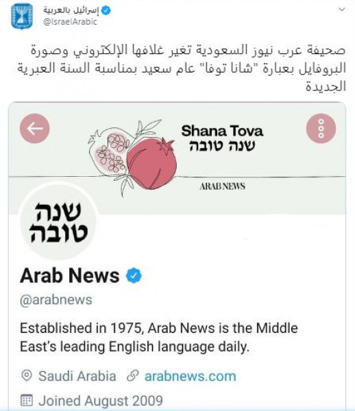 قامت صحيفة (عرب نيوز) السعودية، بتغيير صورة البروفايل وصورة غلافها على موقع (تويتر) إلى صورة تحمل عبارة (شانا توفا) أي (سنة سعيدة) باللغة العبرية، وهو الأمر الذي أثار إعجاب وزارة الخارجية الإسرائيلية.