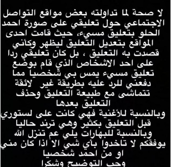 وأضافت:"وبالنسبة للأغنية فهي كانت على لستوري قبل التعليق بكثير وهي ترند حالياوبالنسبة للبهارات يلي عم تنزل الله يوفقكم لا تاخدوا بأي شي الا اذا كان مني او من احمد شخصياوجب التوضيح وشكرا".