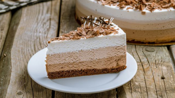 3- لتحضير الطبقة الثالثة: في وعاء، أخفقي الكريمة، السكر، والفانيليا حتى يكثف المزيج. في وعاء ثانٍ، أخلطي الكاكاو وجبن الكريم حتى يتجانس المزيج. أضيفي خليط الشوكولاتة بالتناوب مع مزيج الجيلاتين والماء إلى مزيج الكريمة وقلّبي المزيج حتى يتجانس. إفردي المزيج فوق الطبقة الثانية.