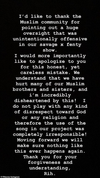 ونشر أحد المعجبين اعتذارا وصله من ريهانا عبر الرسائل الخاصة في إنستغرام، حيث كتبت له "شكراً لك على مراسلتي، لقد علمنا ذلك، ونحن نهتم بالأمر الآن، لم يكن لدي أي فكرة، آمل أن لا يفكر الناس أنني قمت بهذا العمل بقصد الإهانة، لأنكم تعلمون أنني لا يمكن أن أقوم بذلك، لذلك سأقوم بحذف هذا المقطع، ولكن ذلك لا يمحي ما حدث، أشعر بالسوء لأنني تسببت بالأذى للآخرين، حتى وإن كان ذلك بدون علمي، تأذى المجتمع الإسلامي بسببي وهذا يحزنني".