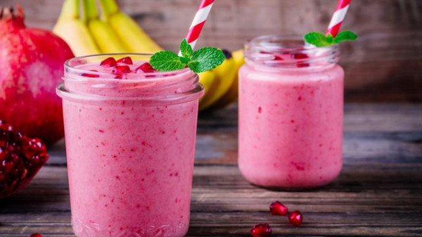 1- في الخلاط الكهربائي، ضعي لبن الزبادي والرمان. أخلطي المزيج حتى يصبح ناعماً.