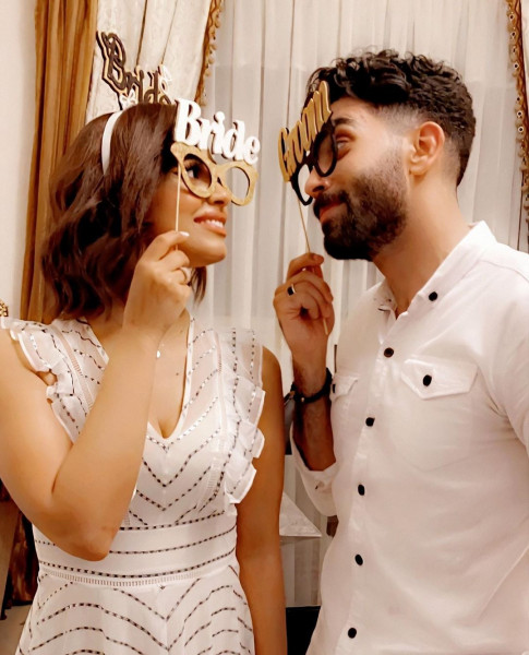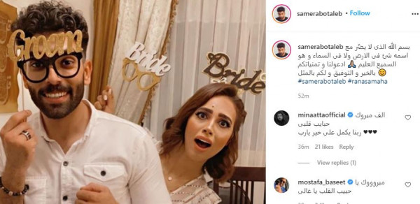 من جانبه، نشر الملحن سامر أبو طالب صورة أخرى مع خطيبته عبر حسابه الشخصي على انستجرام معلقا :" بسم الله الذى لا يضُر مع اسمه شيء في الأرض ولا في السماء وهو السميع العليم .. ادعولنا وتمنياتكم بالخير والتوفيق ولكم بالمثل".