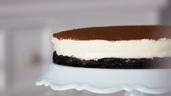 3- رصّي مزيج الأوريو في صينية متحركة القاعدة. أضيفي مزيج الكريمة وافرديه بواسطة سباتولا. زيّني الوجه ببودرة الكاكاو.
