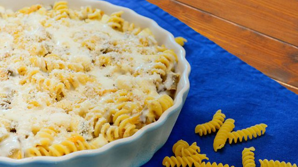 10- أسكبي نصف صلصة البشاميل على الباستا ثمّ أضيفي جبن الموزاريلا وقلبي المكونات في وعاء.
