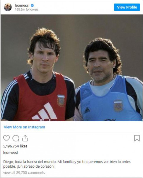 وأرفق ميسي الصورة بالقول: "دييغو، كل القوة الموجودة في العالم لك. أنا وعائلتي نريد أن نراك بصحة جيدة في أسرع وقت ممكن. عناق من القلب".