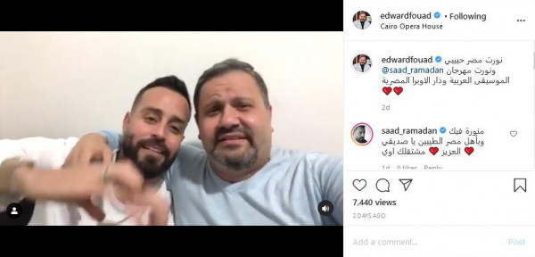 وعلق إدورد على الفيديو"نورت مصر حبيبي ونورت مهرجان الموسيقى العربية ودار الاوبرا المصرية"، ورد عليه سعد في تعليق "منورة فيك وبأهل مصر الطيبين يا صديقي العزيز مشتقلك أوي".