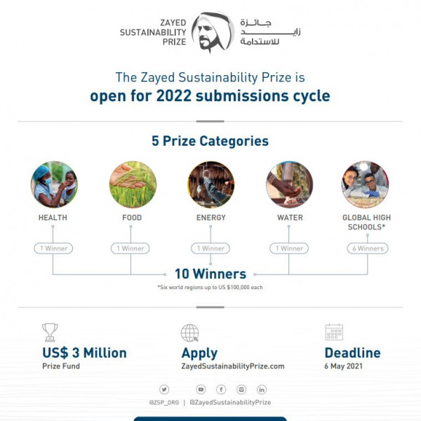 أعلنت جائزة زايد للاستدامة، الجائزة العالمية الرائدة التي أطلقتها دولة الإمارات لتكريم الحلول المستدامة التي تمتلك مقومات التأثير والابتكار والأفكار الملهمة، عن فتح باب تقديم طلبات المشاركة في دورتها لعام 2022.