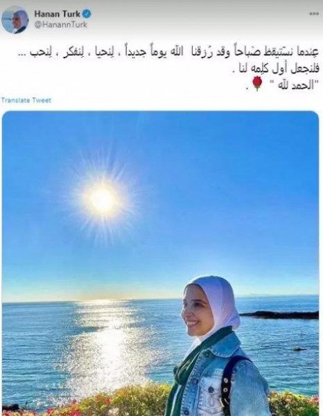 كما نشرت صورة جديدة لها أيضا على موقع (تويتر)، من أمام البحر وكتبت في تعليقها عليها: "عِندما نستيقظ صٓباحاً وقد رزقنا الله يوماً جديداً لِنحيا ، لِنفكر ، لِنحب .. فلنجعل أول كلمة لنا الحمد لله".