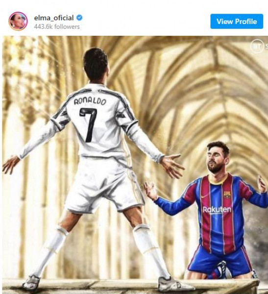 وبعد انتصار رونالدو وفريقه يوفنتوس الإيطالي، على برشلونة الإسباني بقيادة ميسي، نشرت إلما أفيرو، شقيقة النجم البرتغالي، صورة لرسم يجمع النجمين على حسابها بموقع إنستغرام.