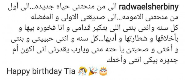 وعلقت :" إلى من منحتني حياة جديدة.. إلى أول من منحتني الأمومة.. إلى صديقتي الأولى والمفضلة كل سنة وانتي بنتي الي بتكبر قدامي وأنا فخورة بيها ..... Happy birthday Tia".