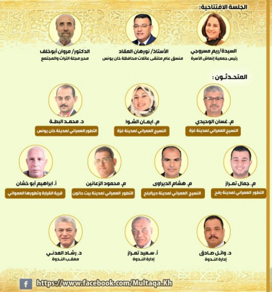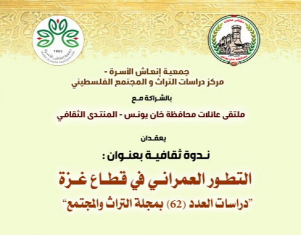 نظم المنتدى الثقافي لملتقى عائلات محافظة خانيونس بالتعاون مع مركز دراسات التراث والمجتمع الفلسطيني بجمعية إنعاش الأسرة، ندوة ثقافية بعنوان: "التطور العمراني في مدن قطاع غزة" وذلك بمشاركة نخبة من الأكاديميين والباحثين المتخصصين في الهندسة والتاريخ والتراث عبر تطبيق زووم.