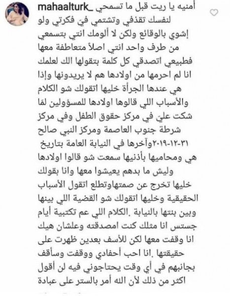 وكتبت مها الترك في ردها على تعليق احد الحسابات الداعمة لمنى السابر: "أمنية ياريت لو تسمحي لنفسك قبل ما تسبي وتشتمي في، فكرتي شوي بالوقائع، لكن لا ألومك لأنك بتسمعي من طرف واحد، ولعلمك انا لم احرمها من اولادها، هم لا يريدونها، واذا عندها الجرأة اتقولك شو الأسباب والكلام اللي قالوها اولادها للمسؤولين لما شكت علّي في مركز لحقوق الأطفال، وآخرها في النيابة العامة"، وفق ما نشرلاته صحيفة (لها).