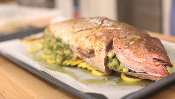 طريقة تحضير سمكة محشوة بالروبيان والبطاطس