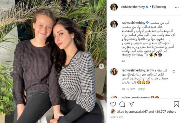 وفي التعليق على الصورة كتبت رضوى: "إلى من منحتنى حياة جديدة. إلى أول من منحتني الأمومة... إلى صديقتى الأولى و المفضلة". وأضافت: "كل سنة وانتِ بنتي اللي بتكبر قدامي وأنا فخورة بيها وبأخلاقها وشطارتها وأدبها...كل سنة و انتي حبييتي وبنتي و أختي وصحبتىي يا حتة منى ويا رب يقدرني اني أكون أم جديرة بيكي انتي وأختك. عبد ميلاد سعيد تيا".