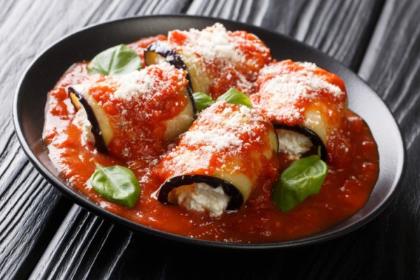 رشّي الجوز المطحون على لفائف الباذنجان بالجبن وقدّميها ساخنة.