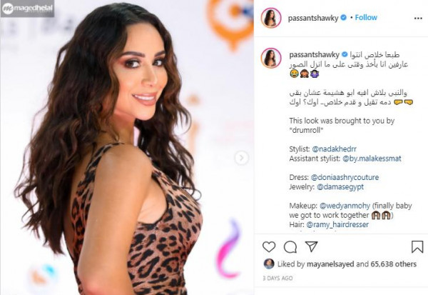 ونشرت مجموعة من الصور من فعاليات مهرجان القاهرة السينمائي، بدت فيها وهي ترتدي فستاناً بنقشة جلد الفهد، وأرفقتها بتعليق يحمل صيغة الهجوم على متابعيها حيث كتبت: "طبعاً خلاص انتوا عارفين انا بأخذ وقتي على ما أنزل الصور، والنبي بلاش إفيه أبو هشيمة عشان بقى دمه تقيل، وقدم خلاص.. أوك؟ أوك"، وفق (لها).