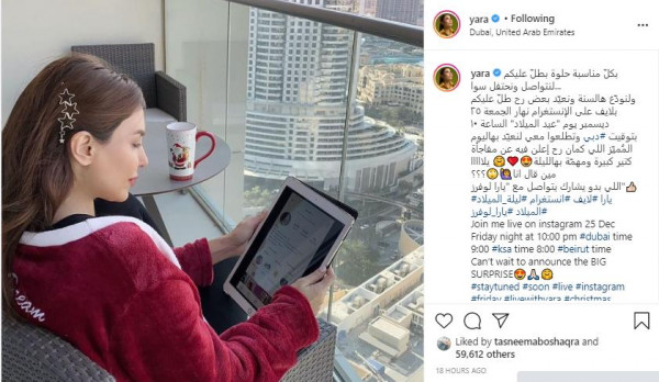 ونشرت يارا عبر صفحتها الرسمية صورة جديدة وأرفقتها بالتعليق التالي: "بكل مناسبة حلوة بطلّ عليكم لنتواصل ونحتفل سوا..ولنودّع هالسنة ونعيّد بعض رح طلّ عليكم بلايف على الانستغرام نهار الجمعة 25 ديسمبر يوم "عيد الميلاد" الساعة 10 بتوقيت دبي وتطلعوا معي لنعيّد بهاليوم المُميّز اللي كمان رح إعلن فيه عن مفاجأة كتير كبيرة ومهمّة بهالليلة، يلااااا مين قال أنا؟؟؟"، وفق (زهرة الخليج).