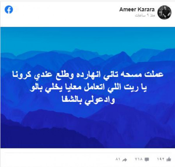 وكتب كرارة عبر حسابه الخاص على موقع التواصل الاجتماعي تطبيق (فيس بوك): "عملت مسحه تاني انهارده وطلع عندي كورونا، يا ريت اللي اتعامل معايا يخلي بالو، وادعولي بالشفا"، وفق (سيدتي).