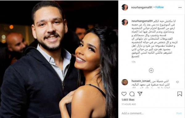 بعدما أعلنت الفنانة المصرية هنا شيحة ارتباطها بمحمود شاهين، طالبت الخطيبة السابقة لمحمود، الفنانة الشابة نورهان جمال من جميع المتابعين احترام مشاعرها وعدم التدخل بحياتها الشخصية، والتوقف عن إرسال فيديوهات وصور لخطيبها السابقة مع الفنانة هنا شيحة.