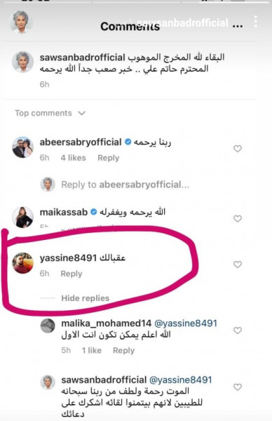 وعلقت عليها بكلمات نعته فيها حيث قالت: "البقاء لله المخرج الموهوب المحترم حاتم علي.. خبر صعب جداً الله يرحمه"، وتلقت سوسن الكثير من التعليقات التي ترحمت على الفقيد، لتفاجأ بأحد متابعيها يتنمر عليها برد قال فيه: "عقبالك" لتحرجه بردها عليه بأسلوب مهذب مما دعاه لحذف تعليقه، وفق (لها).