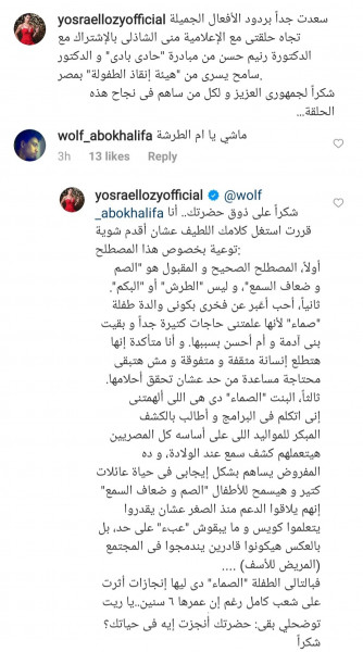 واختارت يسرا أن تردّ فقالت: "شكرا على ذوق حضرتك.. أنا قررت استغل كلامك اللطيف عشان أقدم شوية توعية بخصوص هذا المصطلح.. أولا المصطلح الصحيح و المقبول هو "الصم وضعاف السمع"، و ليس "الطرش" أو "البكم"، وفق (الجميلة).