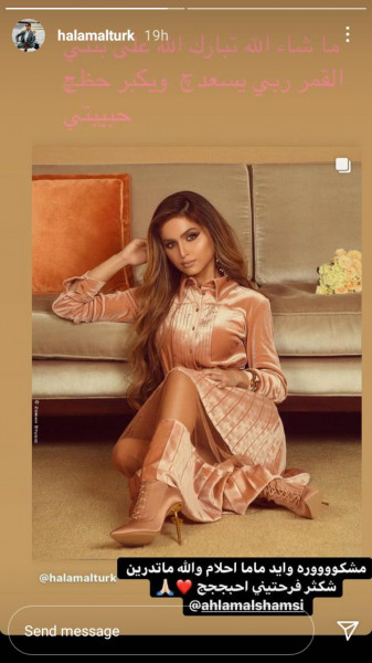وكتبت أحلام متوجهة بكلامها إلى حلا الترك "أحبك أمي وربي يحميك الأم هي جنة الدنيا مهما صار خذي رضاها ابنتي واتركيها على الله هو بيحلها من عنده ويفرجها عليك، دائماً أقول سوف نبدأ من الصفر لا تنسين كلامي لك ومن لا يشعر بألامك في يوم سوف يحسون، بس أمك أمك ثم أمك، أحبك وأنا معك كالعادة".