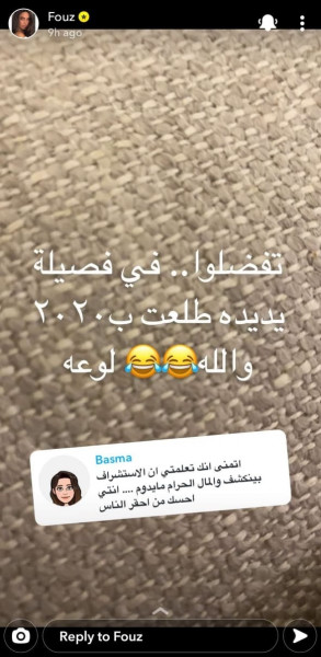 وتلقت فوز الفهد رسالة من إحدى المتابعات، تُدعى (بسمة) حيث وصفتها بأنها (حقيرة)، فكتبت قائلة: "أتمنى إنك تعلمتي إن الاستشراف بينكشف والمال الحرام ما يدوم، أنتي أحسك من أحقر الناس"، لترد فوز الفهد بقولها: "تفضلوا، في فصيلة يديدة طلعت بـ2020، والله لوعة".