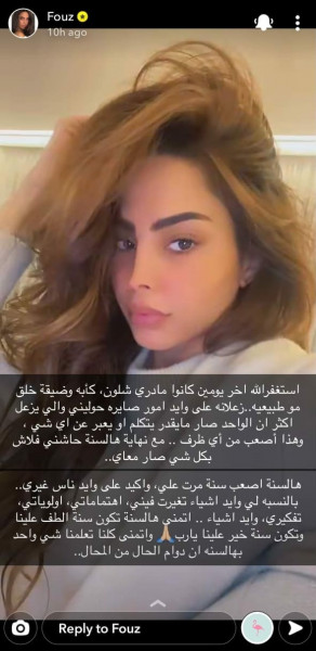 وتابعت الفهد: "مع نهاية السنة حاشني فلاش بكل شيء صار معي، هالسنة أصعب سنة مرت عليّ وأكيد على وايد ناس غيري، بالنسبة لي وايد أشياء تغيرت فيني اهتماماتي أولوياتي تفكيري وايد أشياء، أتمنى هالسنة تكون سنة ألطف علينا وتكون سنة خير علينا يارب، وأتمنى كلنا تعلمنا شيء واحد بهالسنة إن دوام الحال من المحال".