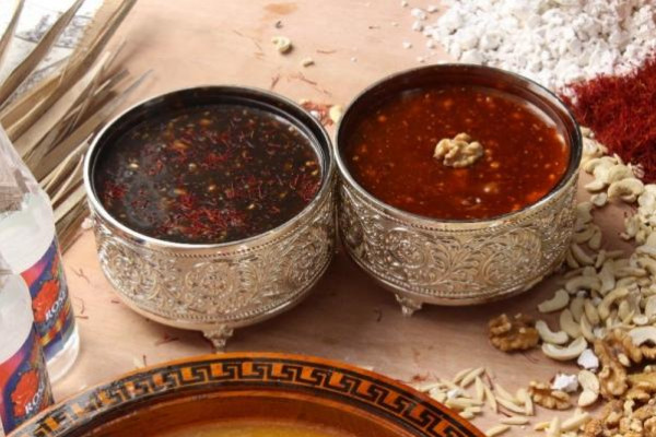 - يذاب الزعفران في كوب من ماء الورد، ثم يضاف إلى الكراميل.
