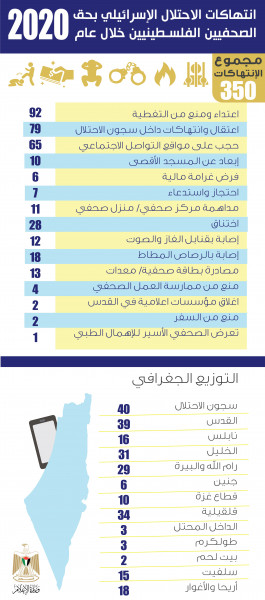 رصدت وزارة الإعلام (350) انتهاكاً ارتكبتها قوات الاحتلال الإسرائيلي بحق الصحفيين الفلسطينيين، وذلك خلال الفترة ما بين 1 كانون الثاني (1)، لغاية أواخر كانون الأول (12) من العام الحالي 2020.