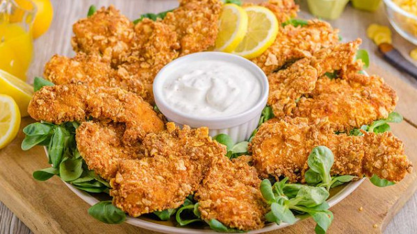 3. نضع قطع الدّجاج في البيض المخفوق ثمّ في إناء فتات الخبز ثمّ نرّتبها في صينيّة خبز.