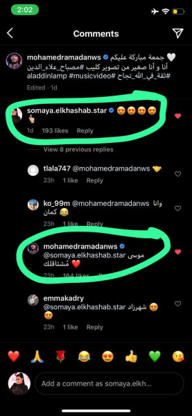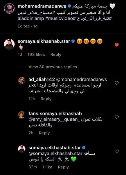 وجاء ذلك بعدما، نشر محمد رمضان صورة له بصحبة الطفل الذي يقدم دوره في العمل، فعلقت سمية برموز قلوب وعلامة رقم واحد، ليرد عليها كاتبا: "موسى مُشتاقلك"، لترد عليه سمية "مسافة السكة"، وفق (لها).