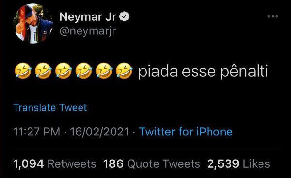 ونشر نيمار، الذي غاب عن المواجهة بسبب الإصابة، "تغريدة" ساخرة عبر حسابه الرسمي على موقع "تويتر"، عبر فيها عن دهشته من احتساب الحكم ركلة جزاء لفريق برشلونة في الدقيقة 26 من زمن الشوط الأول.