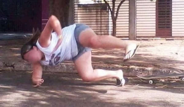 يبدو أن السقوط سيئ بشكل خاص، لأن الفتاة ترتدي فقط قميصا وسروالا قصيرا، وبما أن ركبتها كانت عارية فتوقعوا الألم الذي احست به حين لامست الأرض أثناء السقوط.