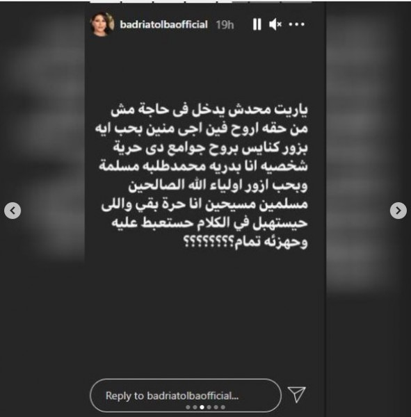 ويبدو أن هذه الانتقادات أشعرت طلبة بالاستياء، فردّت عليها من خلال الخاصية نفسها وكتبت: "يا ريت محدش يدخل في حاجة مش من حقه، أروح فين أجي منين بحب إيه بزور كنايس بروح جوامع دي حرية شخصية".