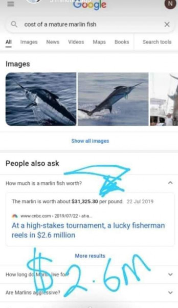 وتبدو القصة عادية في البداية، و لكن السمكة التي اصطادها الشاب ليست سوا سمكة من نوع "بلو مارين"، وهي إحدى الأنواع النادرة والباهظة الثمن، حيث إن سعر السمكة يصل لـ2.6 مليون دولار، وفق (سبوتنيك بالعربي).