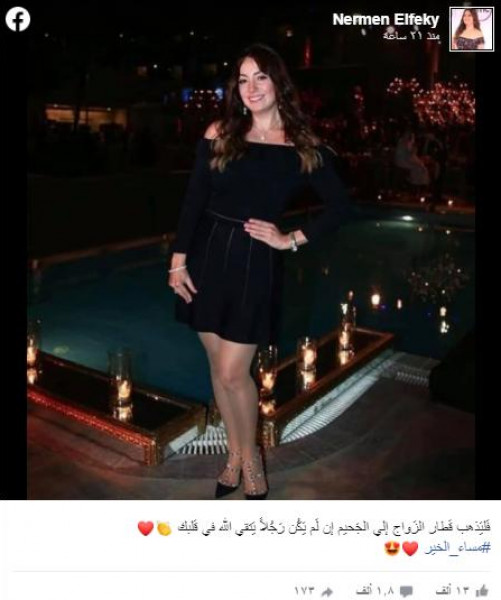 وقالت نرمين الفقي، عبر حسابها على تطبيق التواصل الاجتماعي (فيس بوك): "فَليَذهب قَطار الزواج إلى الجحيم إن لَم يَكُن رَجُلاً يَتقي الله في قَلبك، ووجدت تفاعلا كبيرا من متابعيها وتقدم بعضهم على خجل بطلب الزواج"، وفق (سبوتنيك بالعربي).