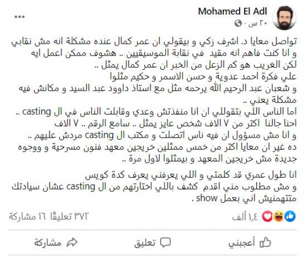 وقال: "تواصل معايا د. أشرف زكي وبيقول لي إن عمر كمال عنده مشكلة إنه مش نقابي وأنا كنت فاهم أنه مقيد في نقابة الموسيقيين.. هشوف ممكن أعمل إيه لكن الغريب هو كم الزعل من الخبر أن عمر كمال يمثل، على فكرة أحمد عدوية وحسن الأسمر وحكيم مثلوا وشعبان عبد الرحيم الله يرحمه مثل مع أستاذ داوود عبد السيد ومكانش فيه مشكلة يعني".