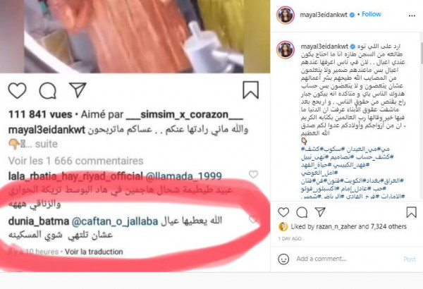 وعلّقت العيدان على المقطع قائلة: "والله ماني رادتها عنكم.. عساكم ماتربحون"، وهو ما دفع الفنانة المغربية المثيرة للجدل لترك تعليق عند مي كتبت فيه: "الله يعطيها عيال علشان تتلهى شوي المسكينة"، وفق (لها).