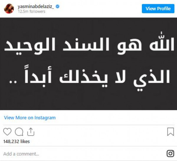 ونشرت ياسمين عبر حسابها الخاص على تطبيق تبادل الصور (انستغرام) صورة مكتوب عليها: "الله هو السند الوحيد الذي لا يخذلك أبدا"، وفق (سبوتنيك بالعربي).