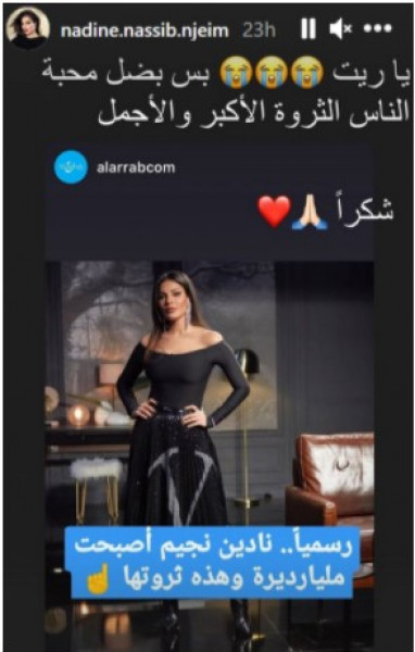 و قامت نادين بتوضيح ما يتداوله الناشطين عبر نشرها صورة لها على خاصية (ستوري) عبر تطبيق تبادل الصور (انستغرام) أرفقتها بالخبر: "رسمياً نادين نجيم أصبحت مليارديرة (بليونيرة) وهذه ثروتها"، وفق (لها).