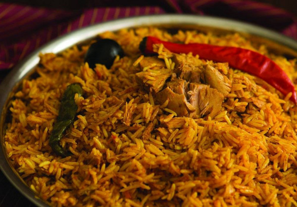 أخرجي الكبسة من الفرن وقدميها ساخنة مزينة باللوز المحمص.