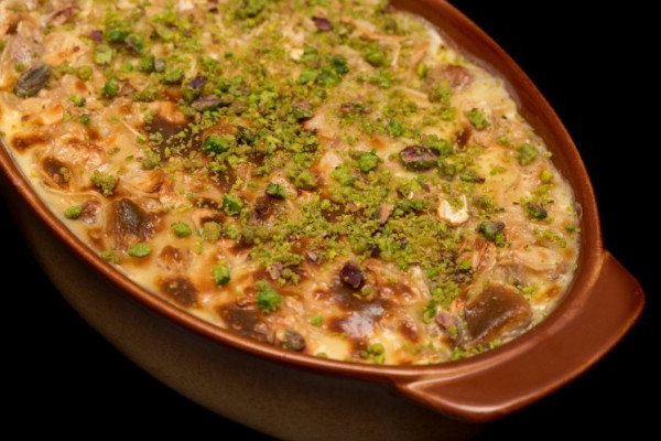 5. أضيفي اللوز الشرائح، وجوز الهند، والفستق الحلبي، والزبيب، وصبي خليط الحليب فوق المكونات.