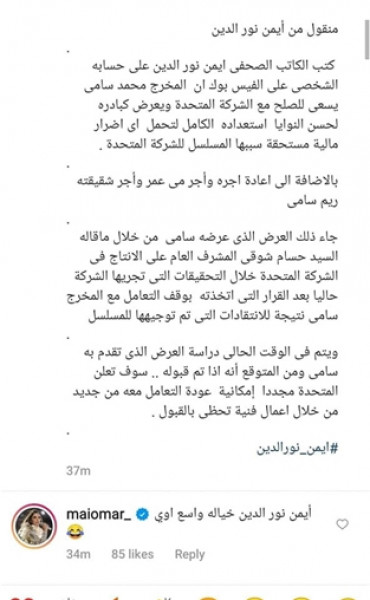 ردت الممثلة مي عمر، على تلك التقارير بشكل ساخر، ووصفت كاتبها بصاحب الخيال الواسع، في تأكيد منها لعدم صحة تلك الأنباء، وهو ما دفع أحد الكتاب الصحفيين المتبنين للخبر للتأكيد على صحة المعلومة والإفصاح عن وقوف والدة محمد سامي وراء تلك المبادرة، في محاولة منها لتقريب وجهات النظر بعد قرار منع التعامل.
