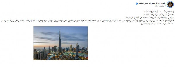 واستطرد بقوله: "كل التقدير لسموه لمنحه الإقامة الذهبية لكثير من الفنانين العرب والسوريين، والتي تتيح لهم فرصة العمل والإقامة المستمرة في ربوع الإمارات".