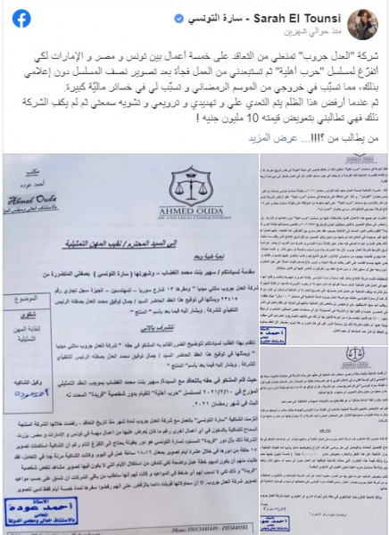و نشرت صورة المذكرة المقدمة منها إلى نقابة المهن التمثيلية في مصر، وعلقت عليها قائلة: "شركة العدل جروب تمنعني من التعاقد على خمسة أعمال بين تونس ومصر والإمارات لكي أتفرّغ لمسلسل "حرب أهلية" ثم تستبعدني من العمل فجأة بعد تصوير نصف المسلسل دون إعلامي بذلك، مما تسبّب في خروجي من الموسم الرمضاني وتسبّب لي في خسائر ماليّة كبيرة".
